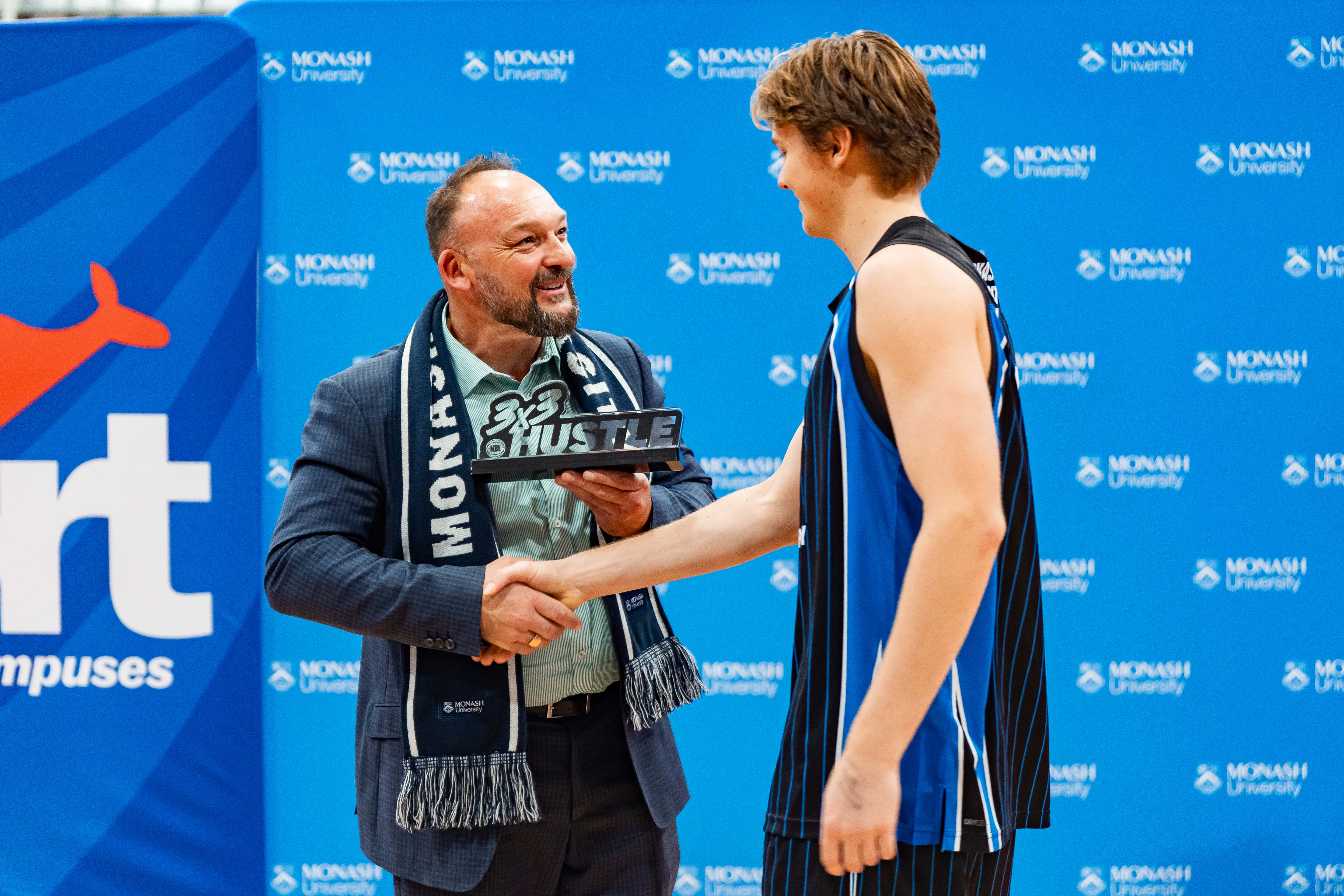 (Left to right): Monash Cheer & Dance, Atmosphere at 3×3 Basketball, Brett Lavale awarding the 3×3 Hustle Men’s Div 2 MVP award to Billy Barton (Monash University Basketball).