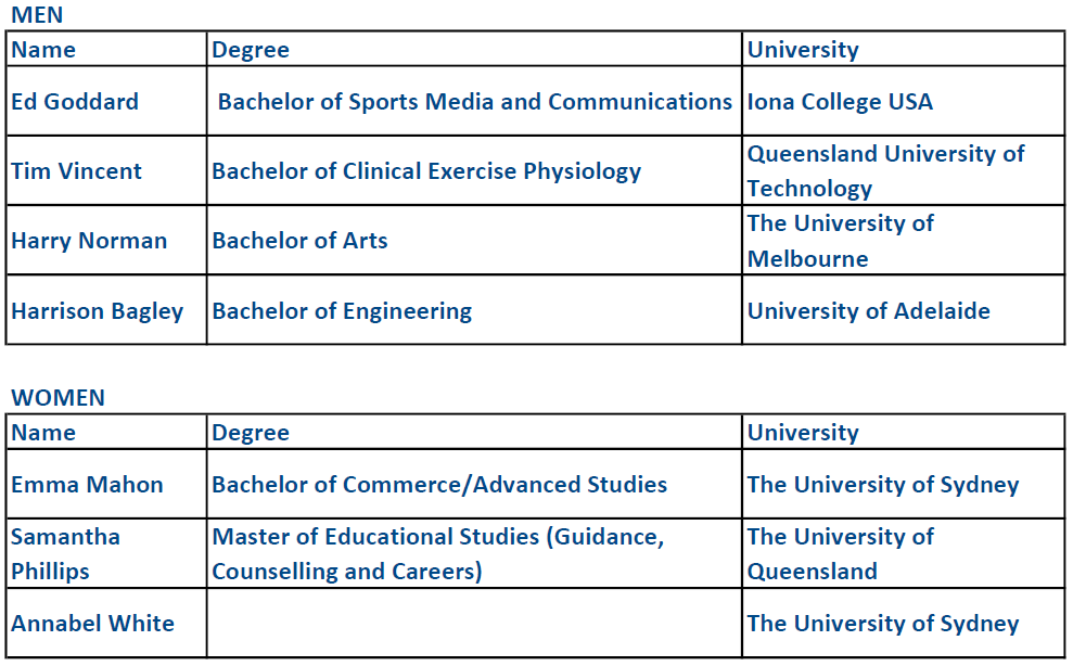 Queensland University of Technology student and 2018 team member Tim Vincent (Bachelor of Clinical Exercise Physiology), Harry Norman (Bachelor of Arts, The University of Melbourne), Harrison Bagley (Bachelor of Engineering, The University of Adelaide) will make up the men’s team, and The University of Sydney students Emma Mahon (Bachelor of Commerce/Advanced Studies) and Annabel White will complete the Australian contingent.