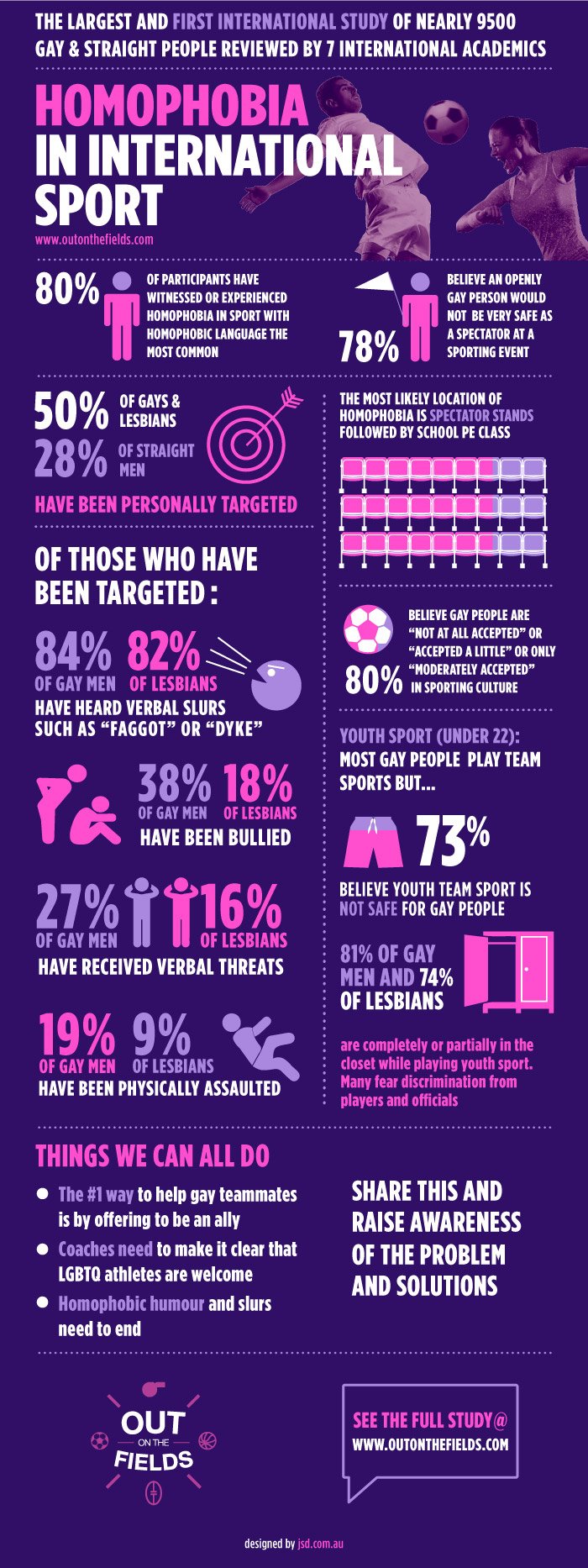Homophobia in Sport GloballyThe statistics in the graphic on the right are from Out on the Fields (2015) and OutSport (2019), the first and second international research on homophobia and transphobia in sport. |